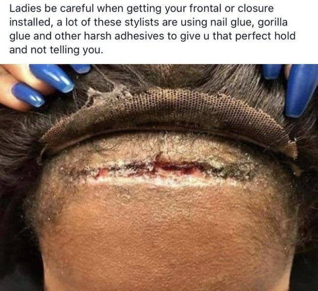 I am hearing more and more about how people in the salon are having there wigs and pieces glued on now with very strong industrial adhesives. Such as gorilla. I would never have thought professionals in the beauty would use such a product. But they are. This can be a health risk for women and also can lead to severe skin disfiguration. Now the cost of beauty should not be that high. And the wants and needs of a individual should not be so reckless. Special effect makeup uses alot of industrial glues, but the safe thing about it they apply a scalp mask first. This way it is in no contact with the human skin. These glues are very very strong and also flammable. Imagine smoking with this applied to your scalp and you catch on fire, even smelling the fumes could be a serious hazard to some people.
